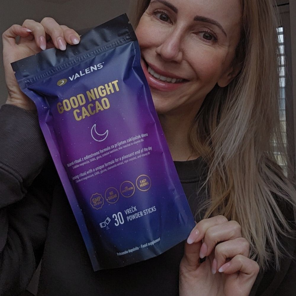 Valens Good Night Cacao je inovativno prehransko dopolnilo, zasnovano za vse, ki si želijo prijeten in umirjen zaključek dneva. Gre za sodoben pristop k večerni rutini – prašek se pripravi v topel ali hladen kakavov napitek, ki združuje skrbno izbrane sestavine v dovršeno formulo za podporo telesu in umu po napornem dnevu.