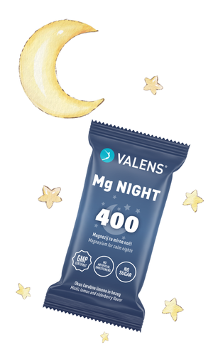 Valens Mg Night je inovativno prehransko dopolnilo v obliki praška za pripravo okusnega napitka. Namenjeno je večerni podpori telesa in uma. Vsebuje magnezij in vitamin B6, ki prispevata k zmanjševanju utrujenosti in normalnemu psihološkemu delovanju, magnezij pa prispeva tudi k delovanju mišic. Izdelek je obogaten še z naravnima izvlečkoma melise in pasijonk, inulinom ter glicinom.
