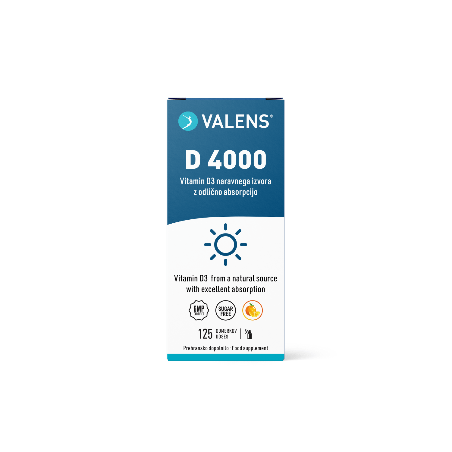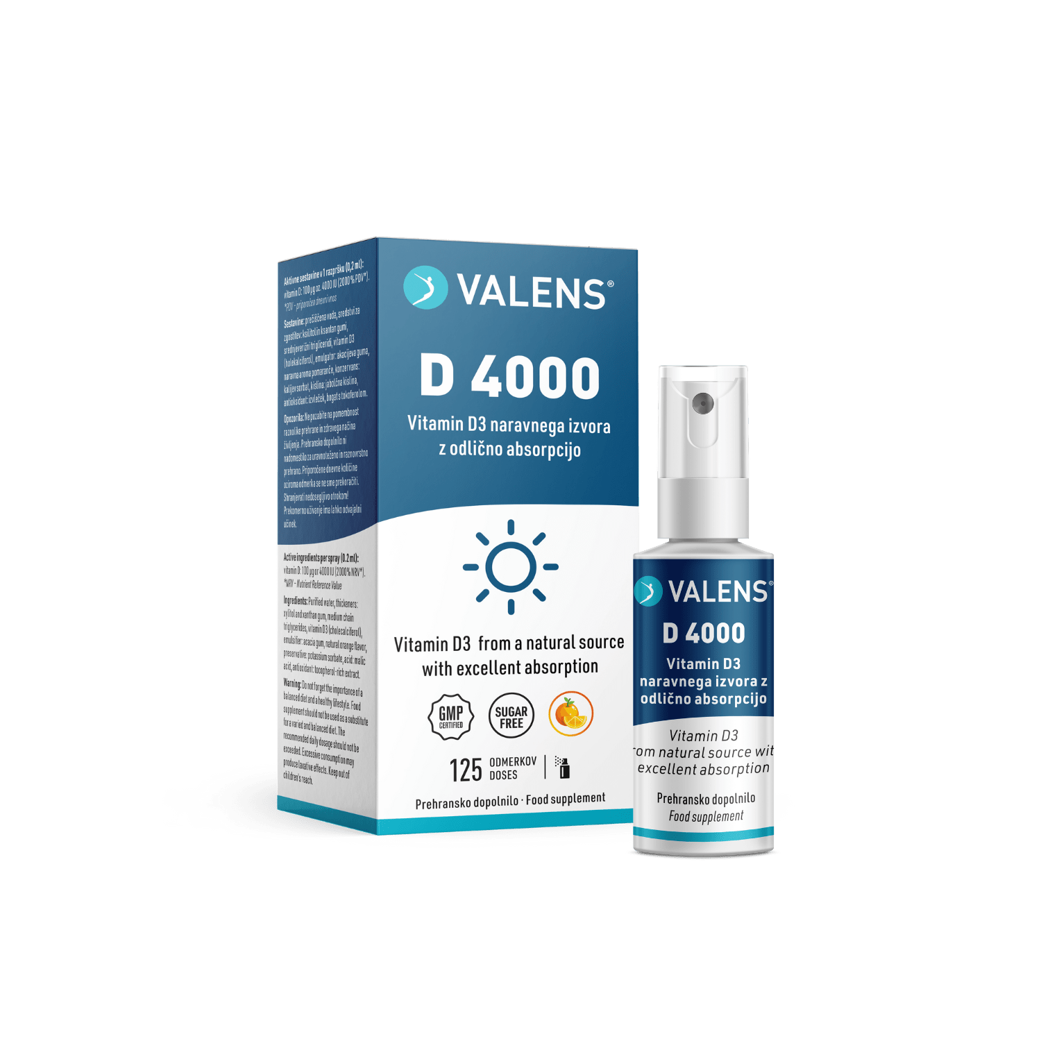 Valens D 4000 je inovativno prehransko dopolnilo v obliki ustnega pršila z odličnim okusom pomaranče. V enem razpršku oz. dnevnem odmerku vsebuje kar 4000 IU vitamina D3 (holekalciferol) naravnega izvora, kar je najvišji odmerek med našimi pršili. Njegova oblika omogoča hitrejšo in boljšo absorpcijo - vitamin D3 se na ta način absorbira že v membranah ustne votline. Izdelek je še posebej priročen za vse, ki imajo težave z absorpcijo v prebavilih, predstavlja pa tudi okusno alternativo kapsulam in tabletam.