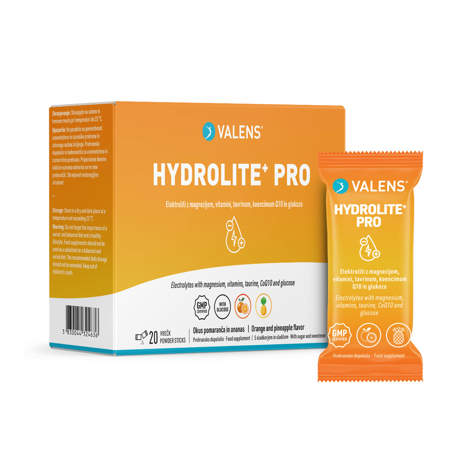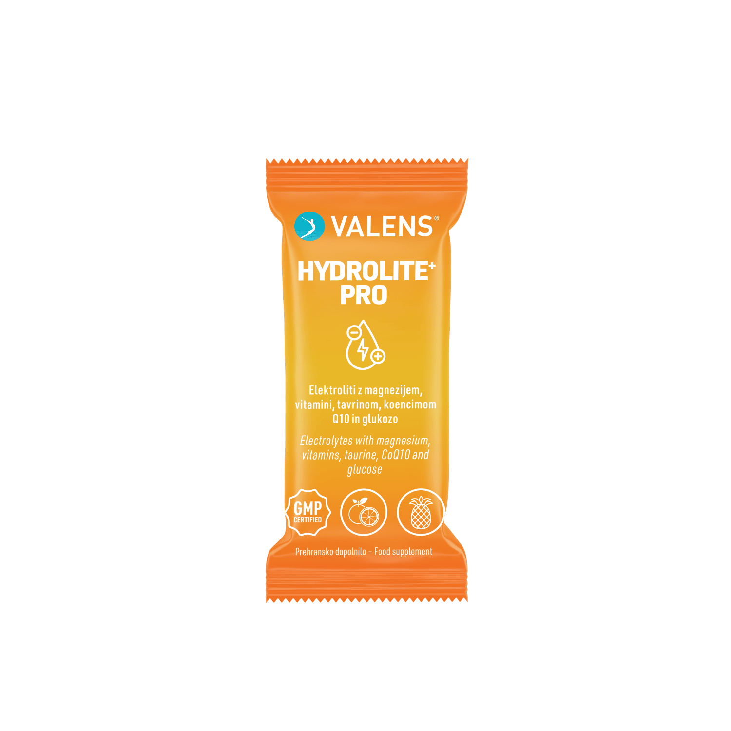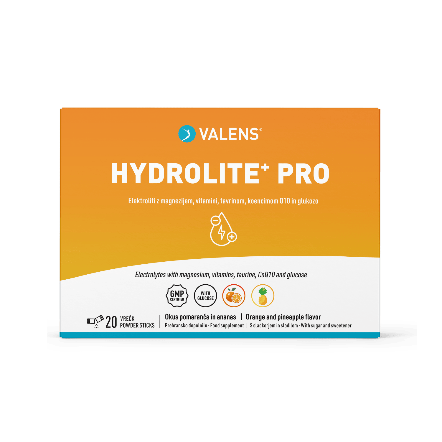 Valens Hydrolite⁺ Pro je inovativno prehransko dopolnilo v obliki praška za pripravo napitka s prijetnim eksotičnim okusom pomaranče in ananasa. Zasnovano je kot uravnotežena podpora telesu za obdobja, ko je izguba tekočine izrazitejša in telo potrebuje dodatno podporo za nadomeščanje mineralov in drugih virov energije: ob intenzivnih športnih naporih, dolgotrajnem potenju, vzdržljivostnih aktivnostih ali drugih večjih telesnih obremenitvah.