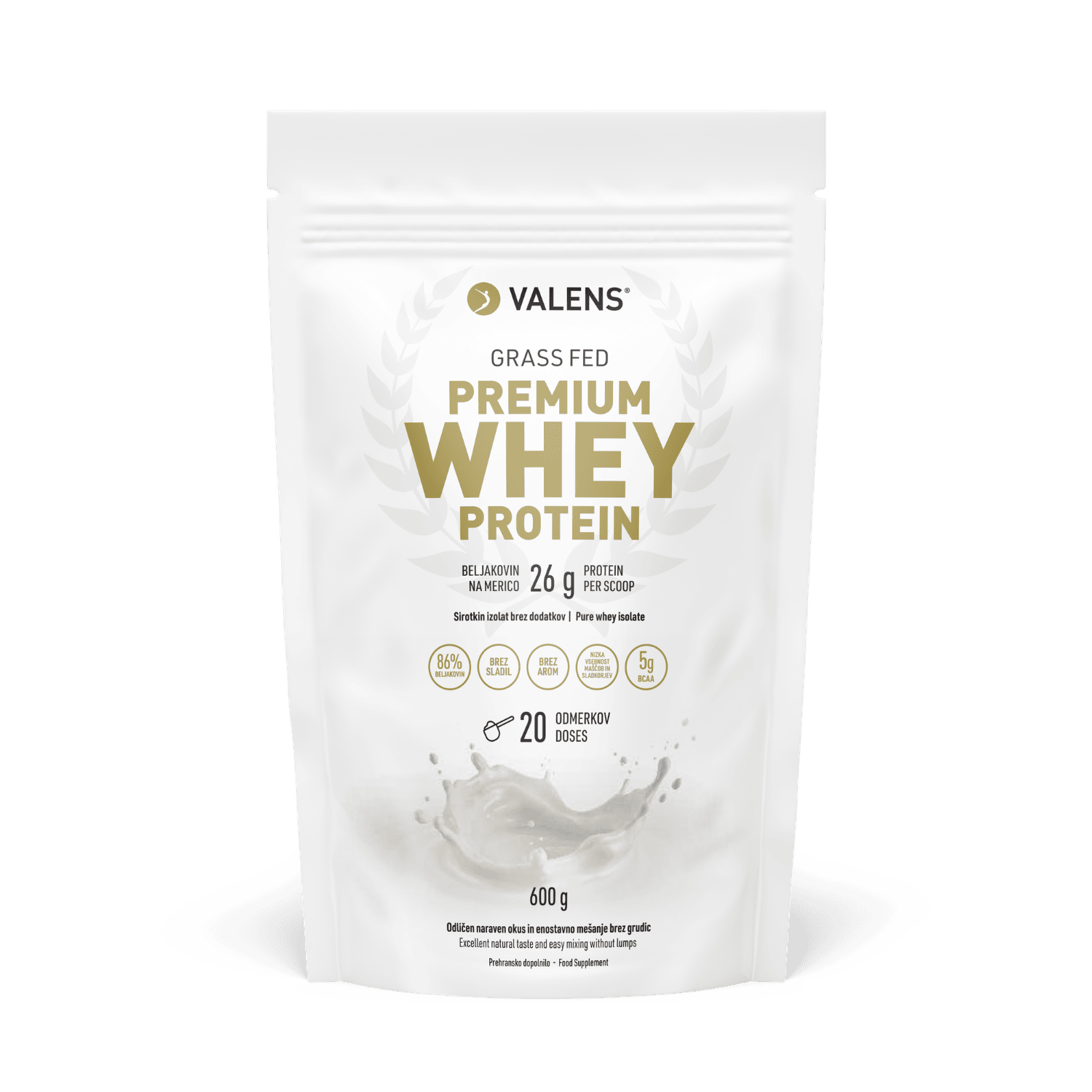 Valens Premium Whey Protein v prahu je kakovostno prehransko dopolnilo za pripravo okusnega proteinskega napitka z izjemno visokim deležem beljakovin. Izdelek vsebuje naravne beljakovine v obliki zelo kakovostnega sirotkinega izolata, ki je dobro prebavljiv in ima odlično aminokislinsko sestavo. Gre za eno najčistejših oblik, saj vsebuje visok delež beljakovin ter minimalno količino maščob in saldkorjev.